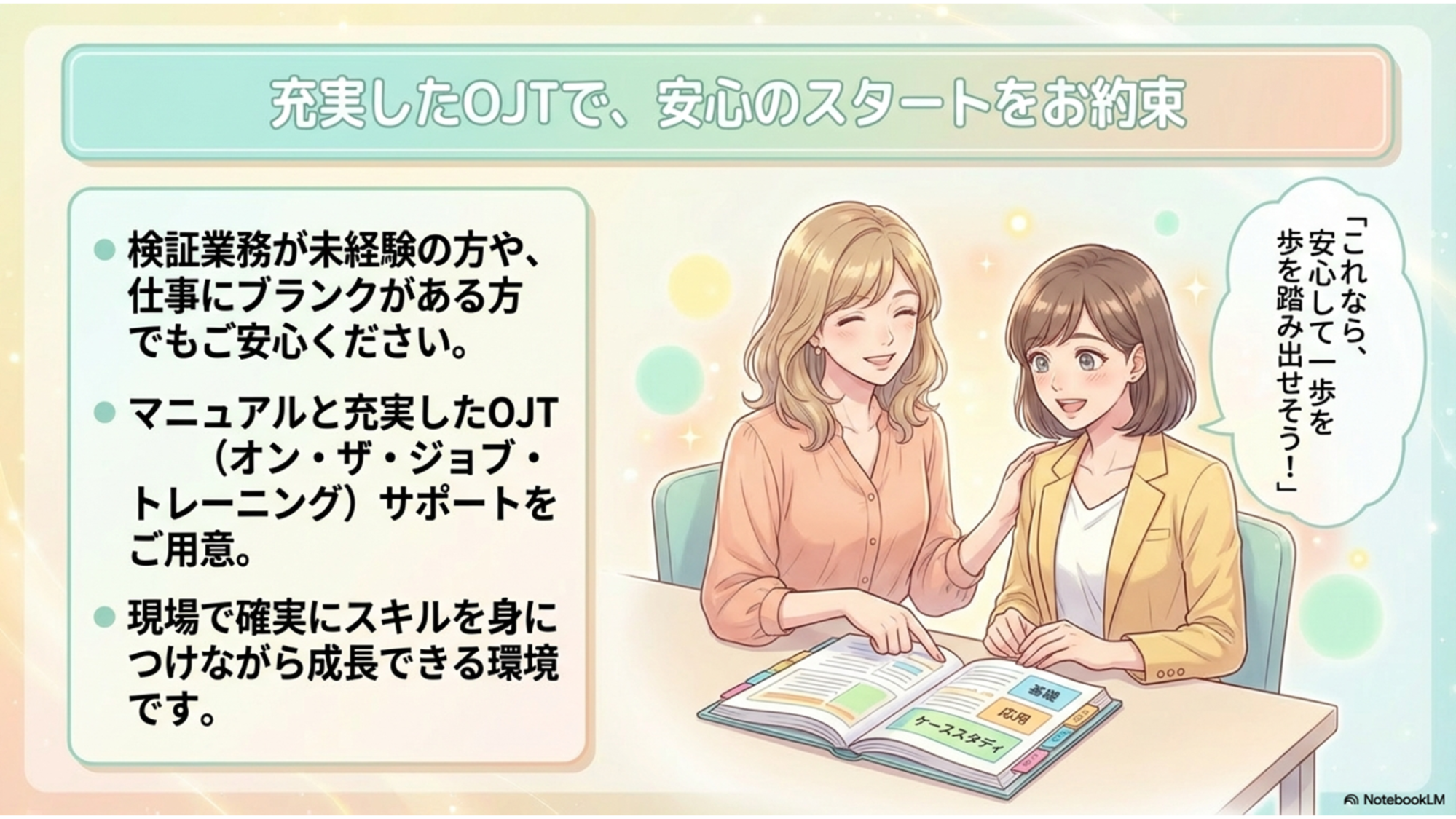 マニュアルと充実したOJTサポートにより、確実にスキルを身につけられます。