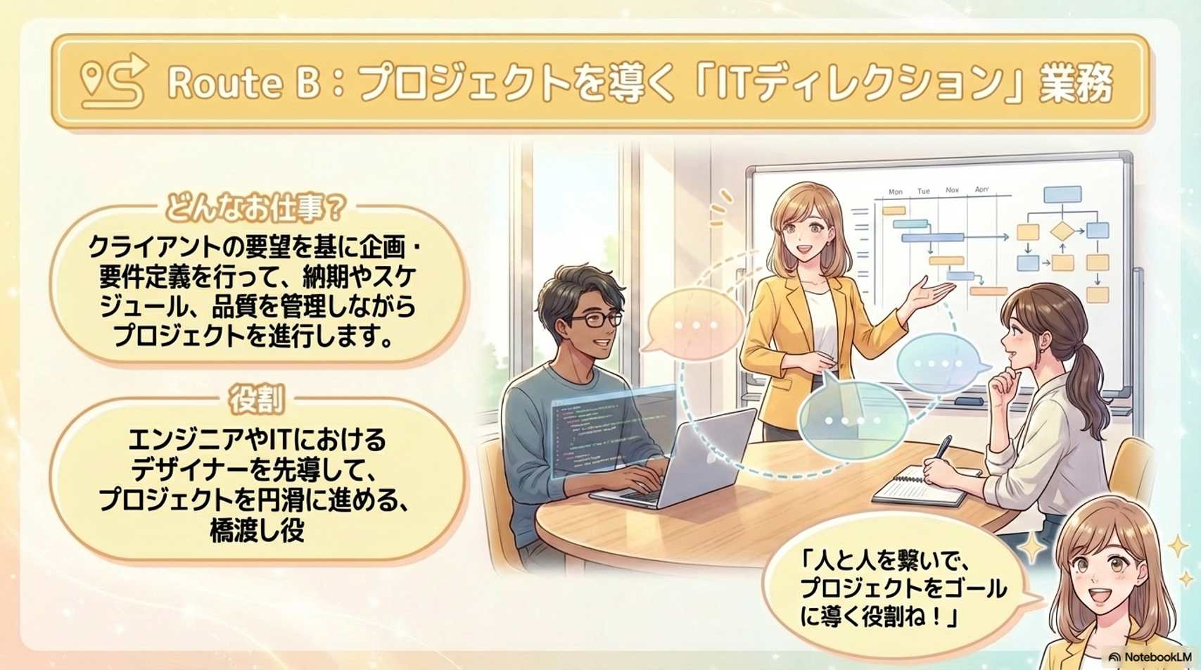 クライアントの要望を基に、チームへの指示出しやタスクの進行管理を行い、プロジェクトを確実なゴールへと導きます。